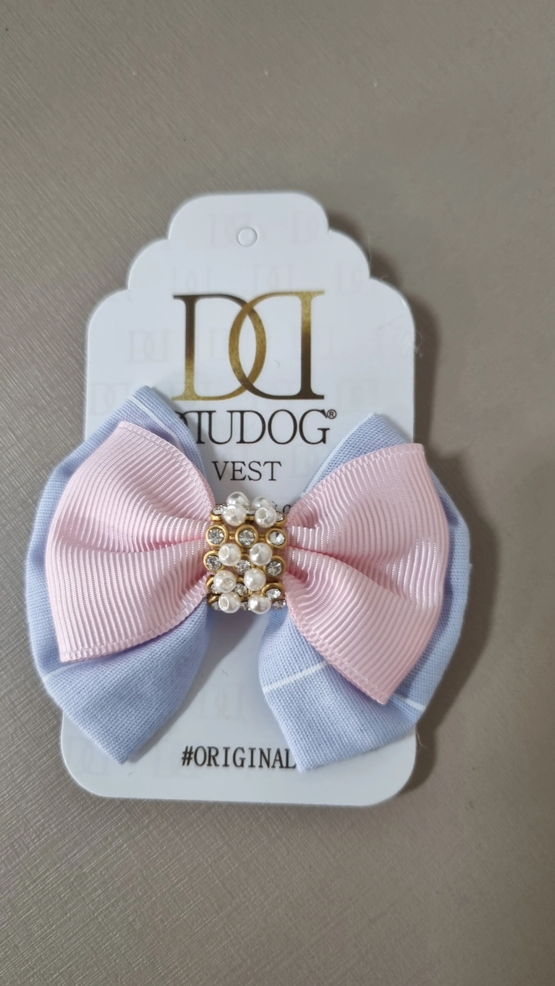 Laço azul e branco com detalhes em pérolas. Presilha de elástico.
