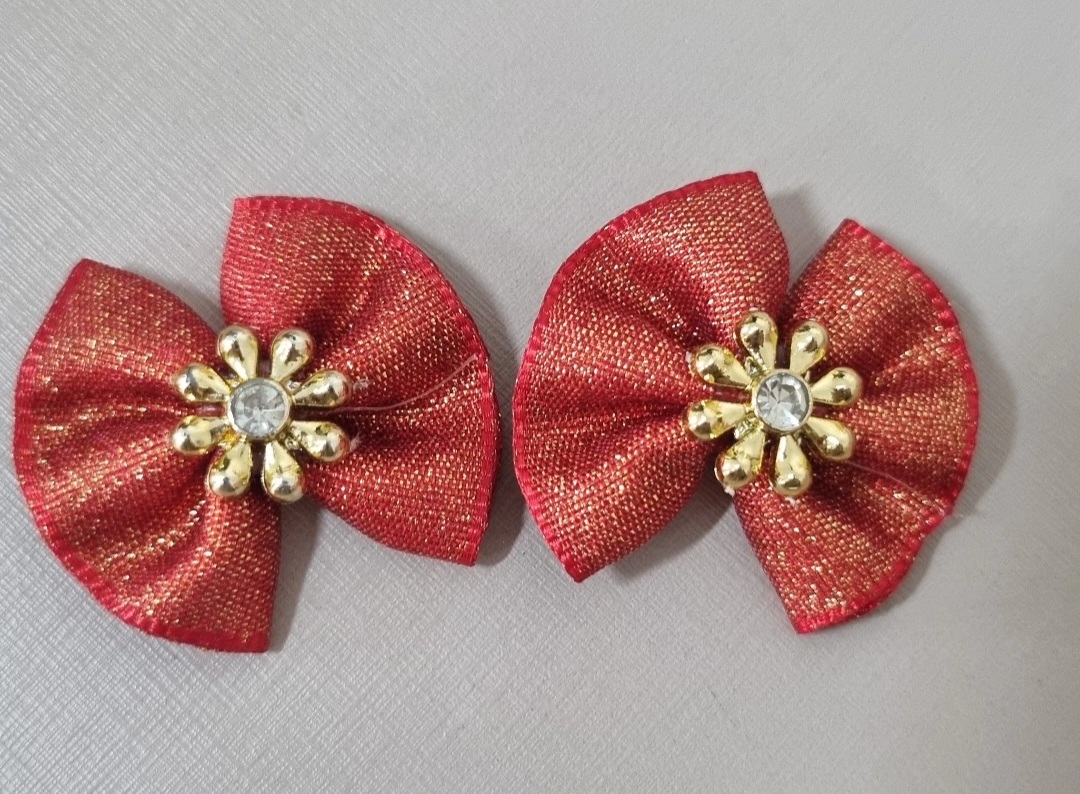 2 Laços com detalhe dourado e glitter. Presilha de elástico.