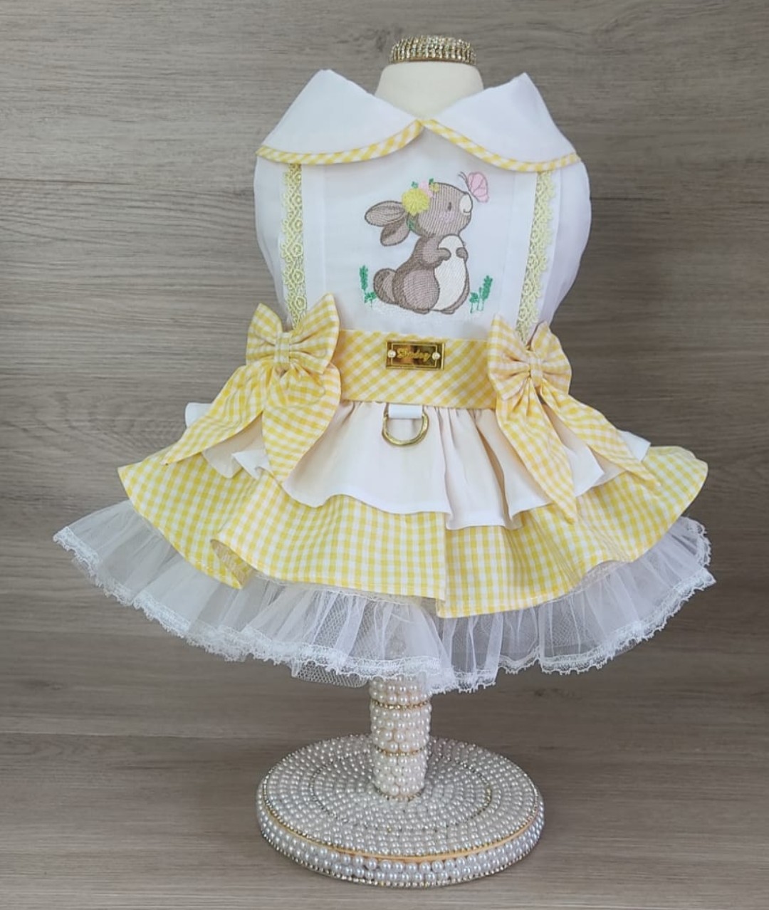 Vestido com saia de babados, 2 laços removíveis, coelha bordada, passador de guia. Fechamento em botões nas costas.