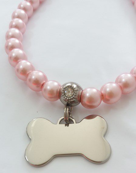 Pra sua cachorrinha causar nas avenidas! Colar de pérolas ABS (não descascam), com fios internos de cabo de aço cirúrgico (bem resistente), com lindo pingente prateado, gravável, com strass no elo. Fecho com correntinha e pingentinho em forma de osso. Um charme!