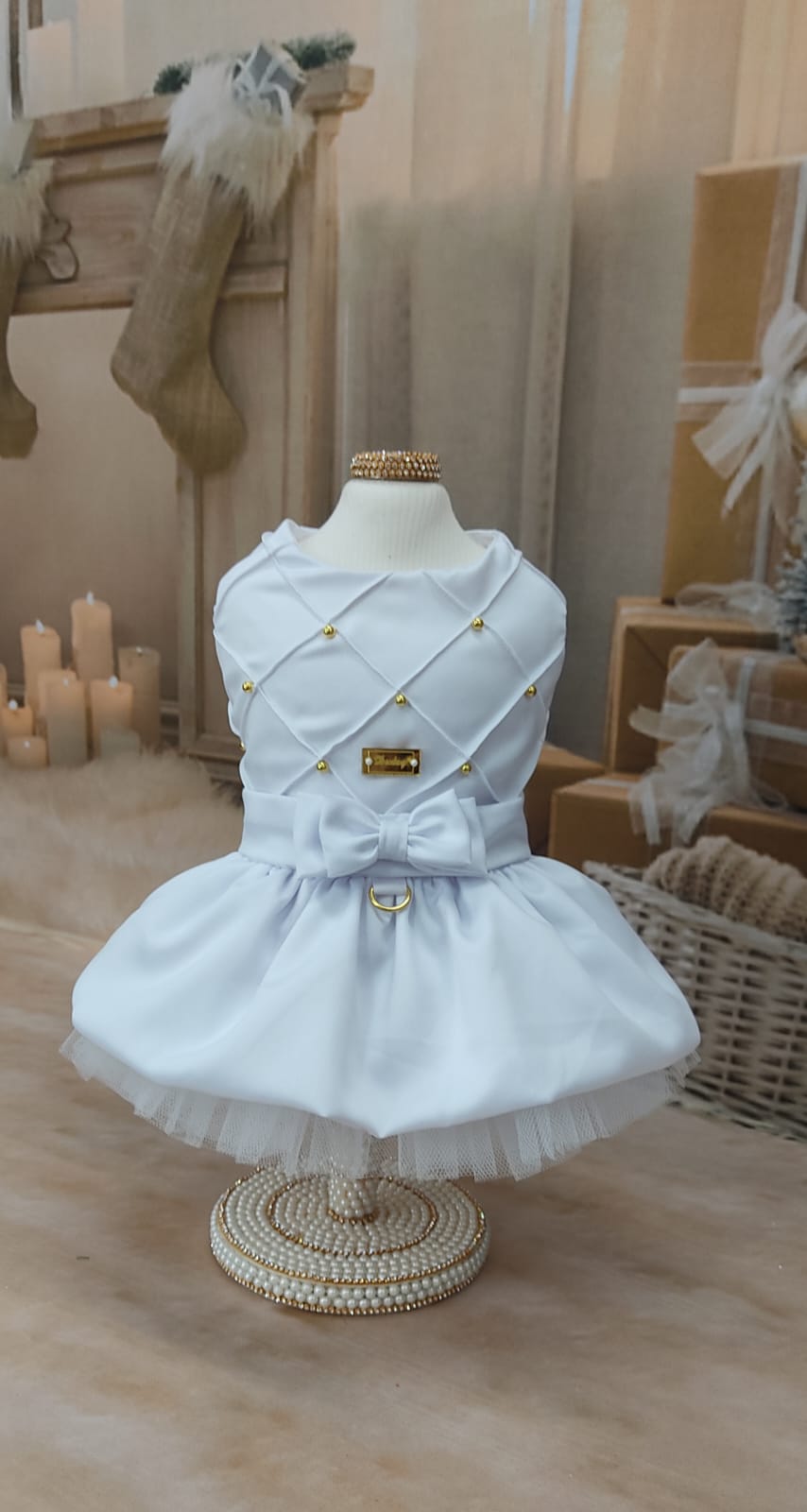 Vestido de luxo em cetim, com saia de tule, passagem para guia e fechamento em botões de pressão nas costas. Laço removível.