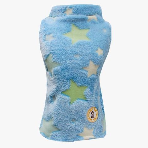 Colete em fleece, rosa, com desenhos imitando tricot. Após contato com a luz (do sol ou lanterna de celular), as estrelas brilham no escuro!