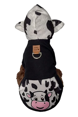 • Roupinha de moletom flanelado na cor preta, com capuz de orelhinha de velboa com estampa de vaca