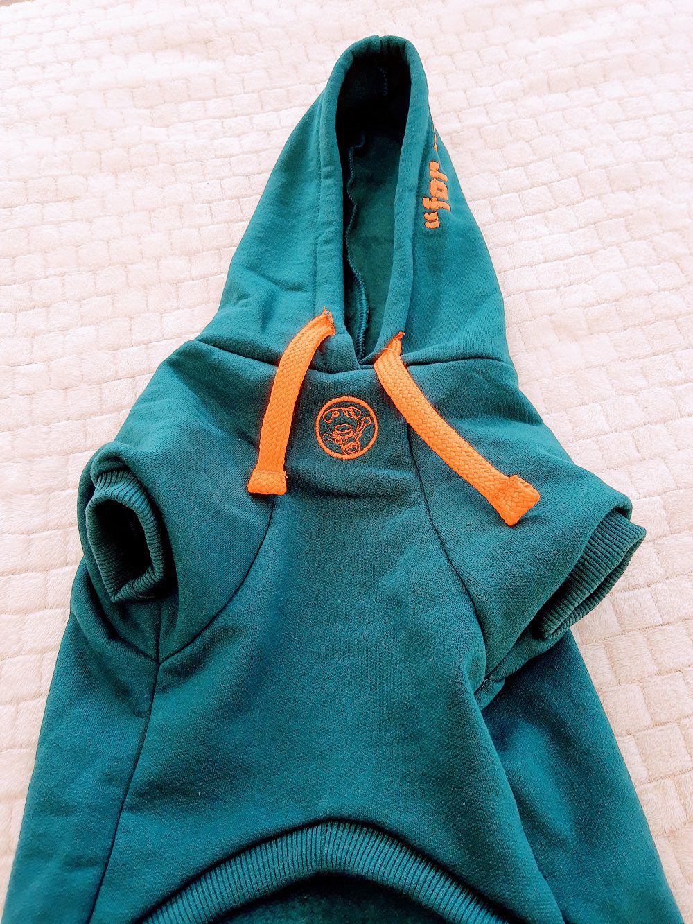 Moletom de excelente qualidade, verde petróleo, com capuz, cadarço laranja, bolsinho e passagem para guia.