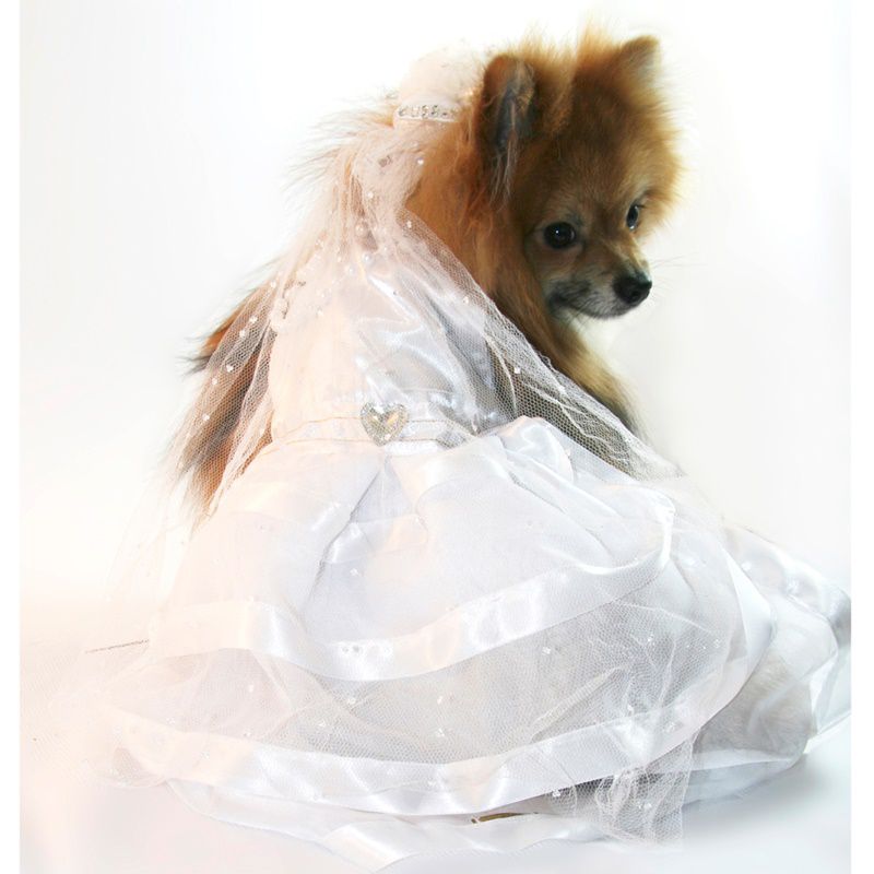 Sua cachorrinha vai ficar muito glamourosa nesse lindo vestido de noiva confeccionado em cetim charmusse, voal, tule e microfibra, com pedra imitando diamante, pérolas sintéticas, fita de cetim, flor no véu, fechamento com velcro.