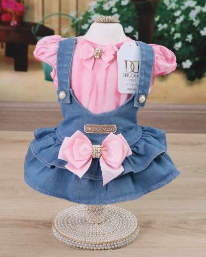 Vestido luxo, tipo jardineira jeans, com babados, laço de enfeite na cintura e pescoço.